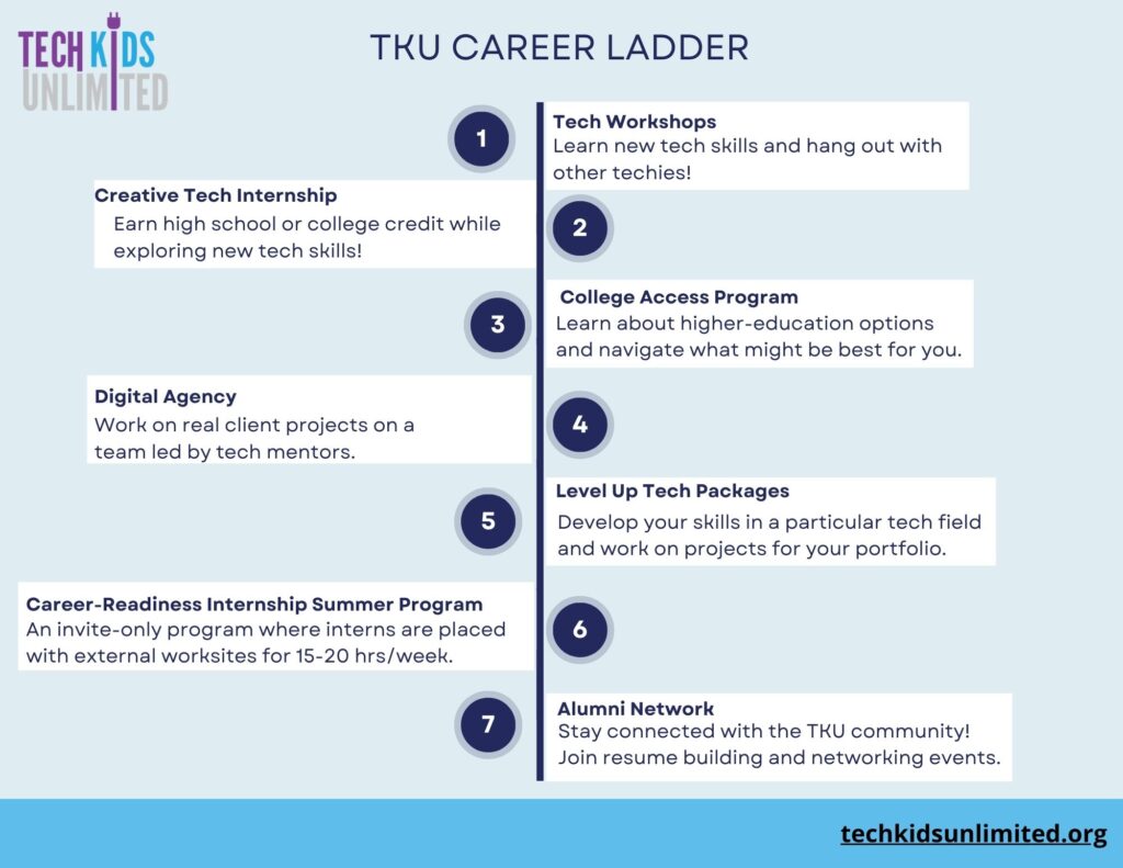 - Tech Workshops: Sunday, after-school, and summer weekly workshops offer foundational skills and exploration of tech topics.